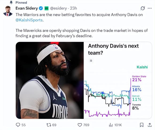 根據(jù)NBA記者埃文-斯迪瑞的報道,目前勇士隊交易得到戴維斯概率升至21%,老鷹16%,活塞11%,猛龍8%。