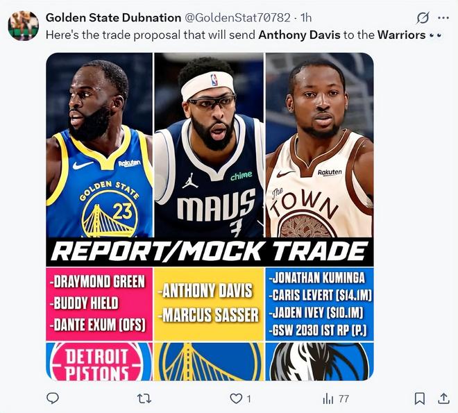 - 濃眉赴勇士概率升至21%!勇媒建議拉活塞成第三方:模擬8人大交易
