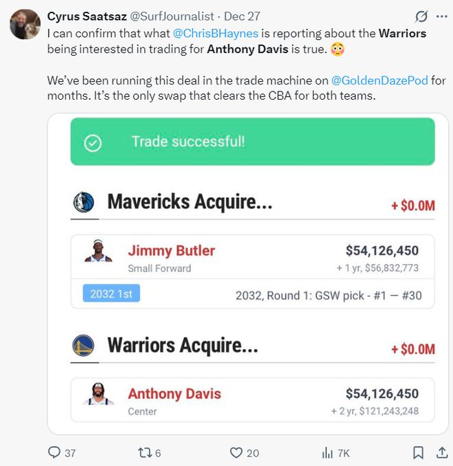 實際上在一天之前,有勇士球迷提出過一筆交易建議,那就是勇吉米-巴特勒+2032年首輪簽換安東尼-戴維斯,因為巴特勒、濃眉的合同匹配,但現(xiàn)在大家都知道獨行俠對勇士隊內(nèi)的球員根本不感興趣,他們肯定也不想要36歲拿5412萬的巴特勒。