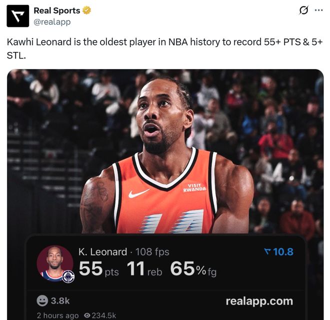 紀(jì)錄二:34歲183天的小卡,成為NBA歷史上單場砍下至少55分5搶斷最老的球員;